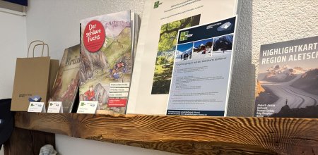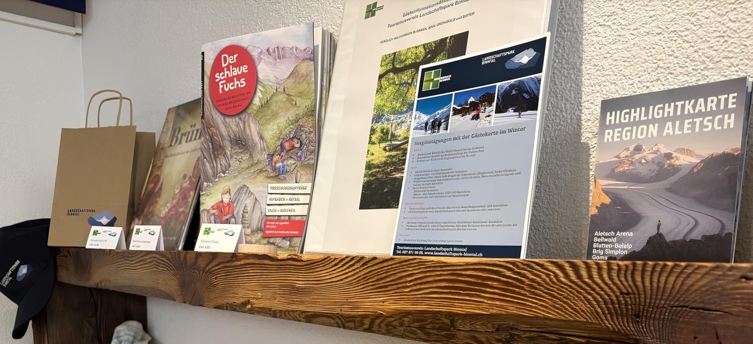Zudem finden Sie hier sämtliche Prospekte und Informationen des Tourismusvereins. Auch besteht die Möglichkeit, ausgewählte Produkte des Landschaftsparks Binntal direkt vor Ort zu erwerben.