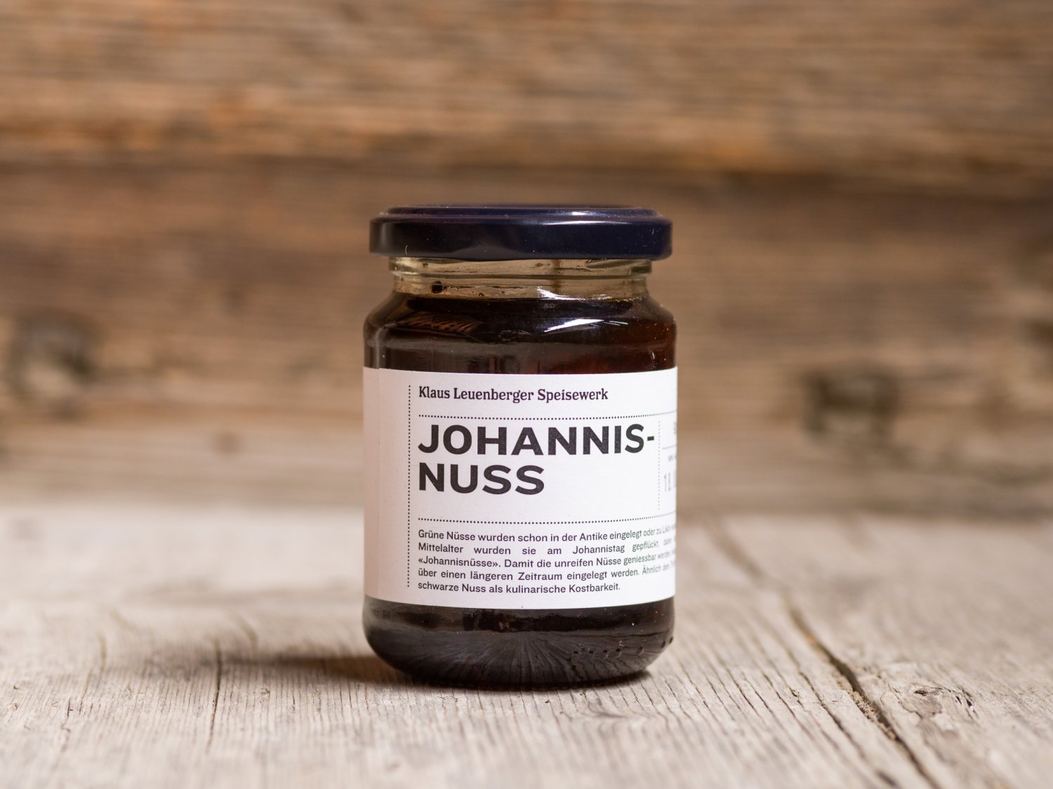 «Johannisnüsse». Damit die unreifen Nüsse geniessbar werden, müssen diese über einen längeren Zeitraum eingelegt werden. Ähnlich dem Trüffel gilt die schwarze Nuss als kulinarische Kostbarkeit.