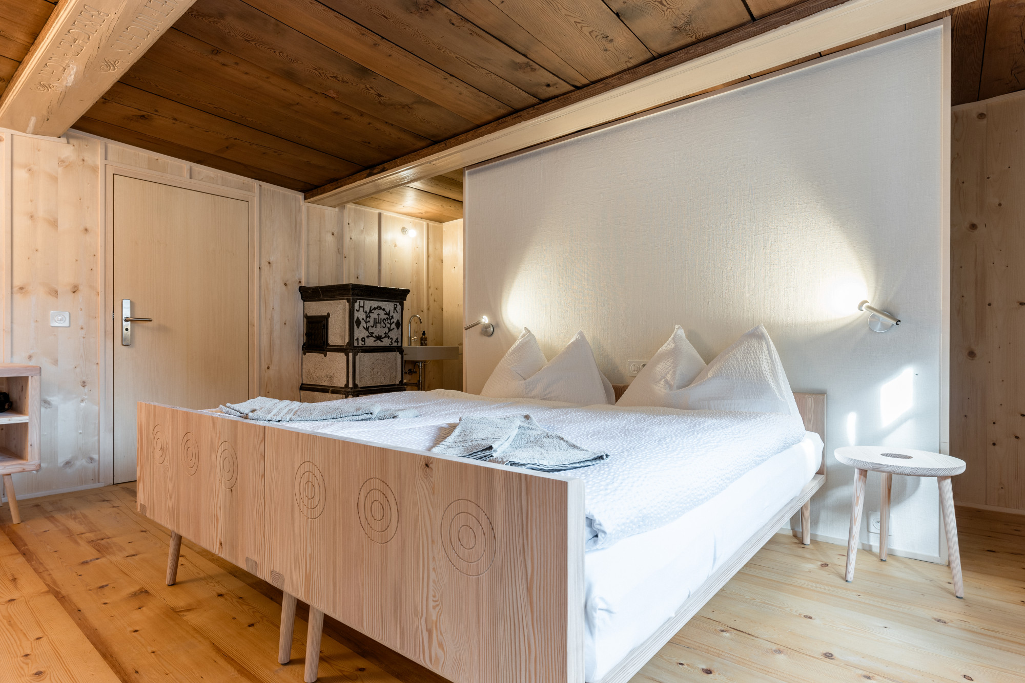 Vorerst stehen dir drei Doppelzimmer zur Auswahl, im nächsten Jahr kommen vier weitere Zimmer hinzu. Die Zimmer sind charakteristisch ausgestattet: Mit Betten und einem Schaukelstuhl aus Walliser Lerchenholz, handgefertigt von einem Schreinerbetrieb der Region. Jedes Zimmer ist für sich ein Unikat, grosszügig und schlicht zugleich, dass dich in die Walliser Tradition eintauchen lässt.